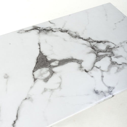 This eye catching table adds a touch of glamour to any dining room. The heat and stain resistant tempered glass top comes in a white and grey marble effect print finish. The gold chrome support frame features 4 wrapped around legs to create a stunning base.
