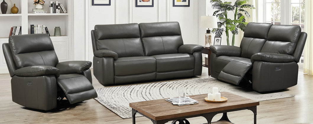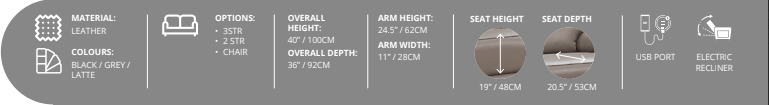 Pairing comfort with its large reclining seat design and detailed cross stitching featured on front of arms. Available in durable cow hide leather. With electric powered reclining, and a handy built in USB port, you will not be compromised on relaxing with family and friends.