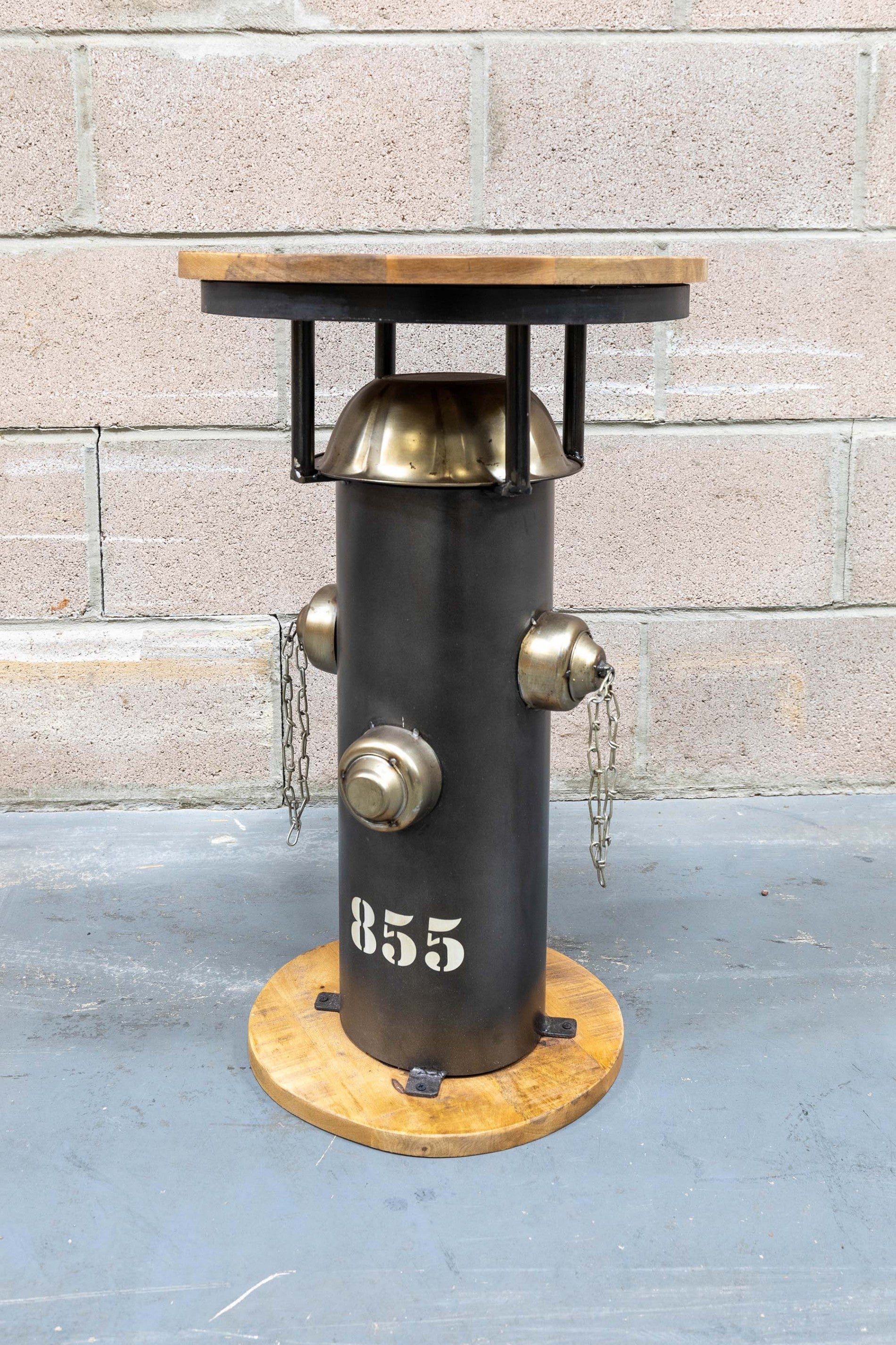 A unique blend of industrial charm and natural elegance, this round side table takes inspiration from classic fire hydrant design. Crafted from a mix of iron and metals, it's topped with a richly grained mango wood surface that adds warmth and texture.